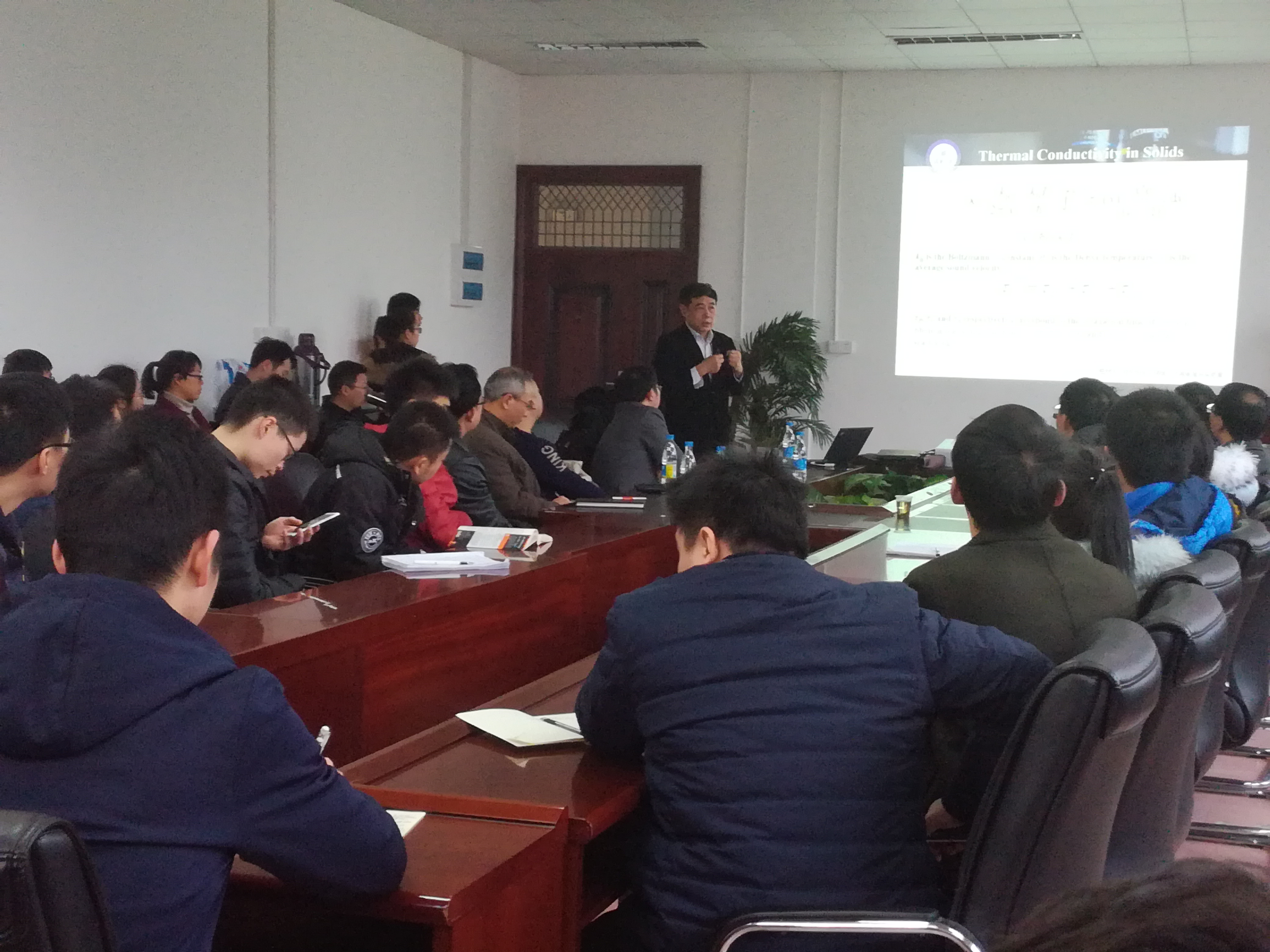 报告会题目为“Improve the Thermal Physical Properties of TBC by Point Defect Engineering”,潘教授介绍了热机高温叶片陶瓷热障涂层的发展背景以及主要特点。陶瓷的热障涂层主要有两个作用:一是防止零件过热,二是提高燃烧温度和发动机的效率。下一代燃气轮机的新型热障涂层将有许多优良性能,如热导率小于<2W /m·k、高温下相稳定、高热膨胀速度、低烧结率、低氧扩散速率等。其中热导率是热障涂层的重要性能参数之一,主要通过固体中的声子散射速度减小热导率,影响声子散射速度的因素主要有点缺陷(空位、阴阳离子空位、替换原子、间隙原子)、位错以及晶界等晶体缺陷。随后潘教授根据gd8+xCa2+y(SiO2)6O2+3x/2+y的实例讲解了点缺陷对热导率的影响,并介绍了3DX射线mapping仪的使用。报告会最后,潘教授与在场师生进行了热切的交流讨论,细心回答了大家提出的问题,全场掌声热烈,气氛十分活跃。