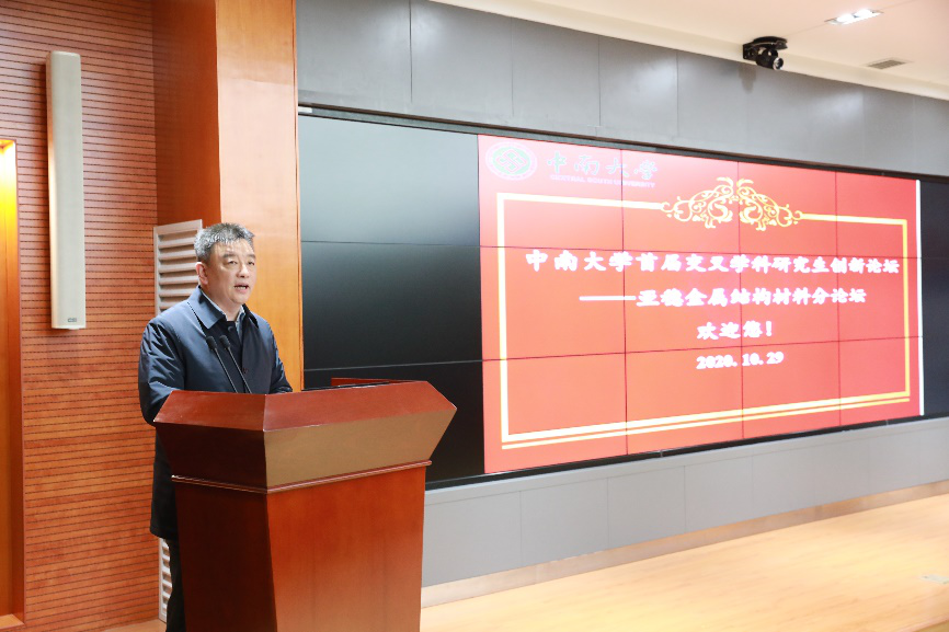 2020年10月29日下午,由伟德bv1946官网首页研究生院主办,伟德betvlctor1946承办的伟德bv1946官网首页首届交叉学科研究生创新论坛亚稳金属结构材料分论坛在科教南楼第一会议室隆重举行。伟德bv1946官网首页副校长周科朝教授,伟德bv1946官网首页研究生院副院长刘光连,湖南大学机械与运载工程学院工程力学系主任方棋洪教授、李甲副教授,国防科技大学李顺副教授,伟德bv1946官网首页粉末冶金研究院院长刘咏教授、高温结构材料研究所所长刘彬教授应邀出席论坛。伟德betvlctor1946院长李周教授、副院长陈志永教授、青年科协主席李志明教授、材料加工工程系主任刘胜胆教授、曾广教授等参加会议,与会研究生分别来自湖南大学,伟德bv1946官网首页机电工程学院、轻合金研究院、粉末冶金研究院、伟德betvlctor1946。会议由伟德betvlctor1946汪冰峰教授主持。