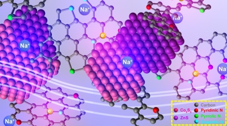 我校十佳博士研究生方国赵和青年教师周江特聘教授,在团队前期工作基础上,利用双金属MOFs为模板,成功开发出一种用于钠离子电池负极的氮掺杂碳包覆双金属硫化物,有效解决了目前钠离子电池负极材料在充放电过程中离子扩散缓慢、材料体积膨胀等瓶颈问题。研发的双金属硫化物与磷酸钒钠匹配成全电池能运行500圈,容量保持率高达93%,在钠离子电池负极方面取得了重要突破。研究成果近日发表在国际能源顶级期刊《先进能源材料》(Adv. Energy Mater., 2018, DOI: 10.1002/aenm.201703155) (IF=16.72)。我院周江特聘教授、潘安强教授、梁叔全教授为论文共同通讯作者,我校为唯一通讯完成单位。