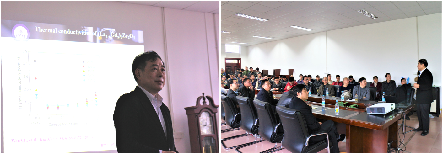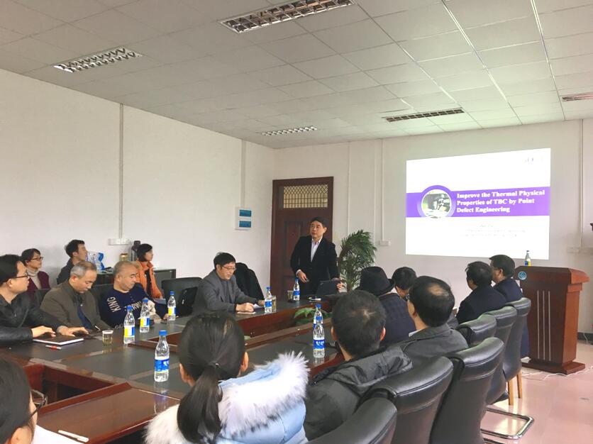 首先,梁院长代表学院对潘伟教授来学校交流讲学表示热烈的欢迎,并隆重介绍了潘伟教授。潘伟教授表示非常高兴在新年伊始能来伟德bv1946官网首页伟德betvlctor1946交流并见到这么多新老朋友,希望此次交流能加强两个学院的合作。此后,潘伟教授围绕“点缺陷对陶瓷材料热导率的影响机制”做了精彩报告。他介绍了飞机发动机高温合金叶片陶瓷热障涂层材料的发展历程及其主要特点,指出发动机热障涂层需满足隔热、高温抗氧化、与基体匹配等要求,其中低热导率是涂层实现隔热的关键因素。潘伟教授带领团队从陶瓷材料微观结构入手,系统研究了氧空位、阴阳离子空位、置换原子、间隙原子等点缺陷对热导率的影响规律,结合YSZ、(La1-xGax)2Zr2O7、Gd8+xCa2+y(SiO2)6O2+3x/2+y、(Sm1-xYbx)2Zr2O7等大量研究实例讲解了如何利用点缺陷调控陶瓷材料热导率。针对热障涂层气孔、裂纹及其它各类缺陷难以计算表征的重大难题,采用涂层离子切割技术,开发专用涂层测试设备,借助3DX射线mapping仪、WinRoof图像分析软件等手段,实现对热障涂层气孔、裂纹等缺陷分布及其比例的精准分析,达到国际领先水平。