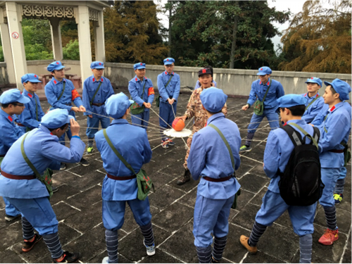 开班仪式结束后,学员们来到南山公园革命英雄纪念广场,开始了以“党的领导是革命事业成功的根本保证”为主题的“三湾改编”情景教学,该情景教学更加具体形象地让学员们了解到当时革命先辈们在井冈山上虽生活艰苦,却始终坚持自己的革命信仰,并在特殊的环境下,提出了“党指挥枪”这一先进政治、军事理念,为日后军队的发展壮大奠定了坚实的基础。随后教官将全体学员分编为红四军团、红五军团两方,开展团队竞赛。由学员们民主选举出党代表、总政委、总参谋长、军长、教导员、炊事员等,并自己设计军团口号、军歌,进行团队风采展示,进行了“破冰热身”、“激情节拍”、“雷区取水”、“同心杆”等团队项目的比拼,使学员充分地感受到“三湾改编”的重大意义以及团队协作的重要性。最后,学员们在革命英雄纪念碑前庄严宣誓,重温入党誓词。