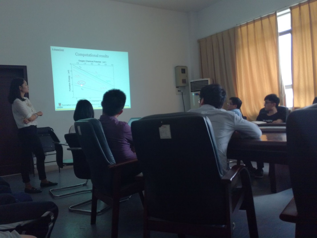 报告会题目为“Magnetic properties of electronic materials by Point Defect Engineering”,王怡人博士介绍了通过缺陷工程分析磁性产生原理的研究过程,理论和实践证明加入几种二维(2D)材料研制成的稀磁半导体(DMS)具有半导体性质和磁性,具有新一代自旋电子器件中的应用前景。DMS中的磁性来源于费米能级上的自旋分裂和自旋电子的交换分裂。然而,这种分裂的驱动力仍不清楚。王博士利用第一性原理计算,研究了在碱性元素、稀土元素和过渡金属(TM)掺杂下几种DMS材料的电子和磁性能和热稳定性。原生缺陷,掺杂缺陷,缺陷复合物都被认为是探索磁性的起源。随后王博士课题组还制备了DMS材料在不同的掺杂,并证实了通过缺陷工程可调整磁耦合。这些发现对未来DMS的制造和应用非常有启发意义。
