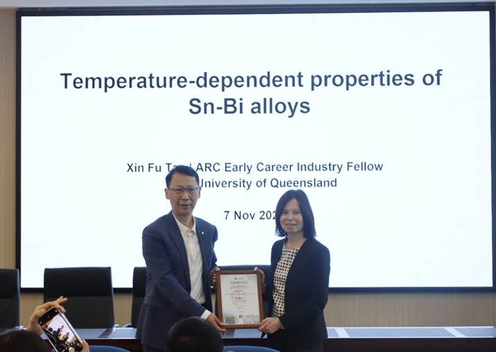 Xin Fu TAN博士就“Temperature-dependent properties of Sn-Bi alloys”方面进行了介绍。Xin Fu TAN博士讨论了Sn-Bi焊料合金随温度的变化,虽然Sn在Bi中的溶解度相对较低,但Bi在Sn中的溶解度可从室温下的约3 wt%到139°C的极冷温度下的21 wt%不等,这导致Bi随着温度的变化溶入Sn中或从Sn中析出,从而使Sn-Bi焊料的微观结构、晶格以及电气和机械性能发生显著变化;介绍了Sn-Bi合金相比于高温焊接-更高的能源消耗和能源成本、容易损坏热敏电子元件以及大面积木板翘曲的问题,低温焊接在经济、技术和环保三个方面更具优势;并通过各种温控原位测试方法对其进行表征,具体包括扫描电子显微镜(SEM)、同步辐射粉末X射线衍射(PXRD)、四点电阻测量和拉伸负载下的原位透射电子显微镜,发现了Sn-Bi合金晶格参数、电阻率和机械性能随温度的非线性变化。