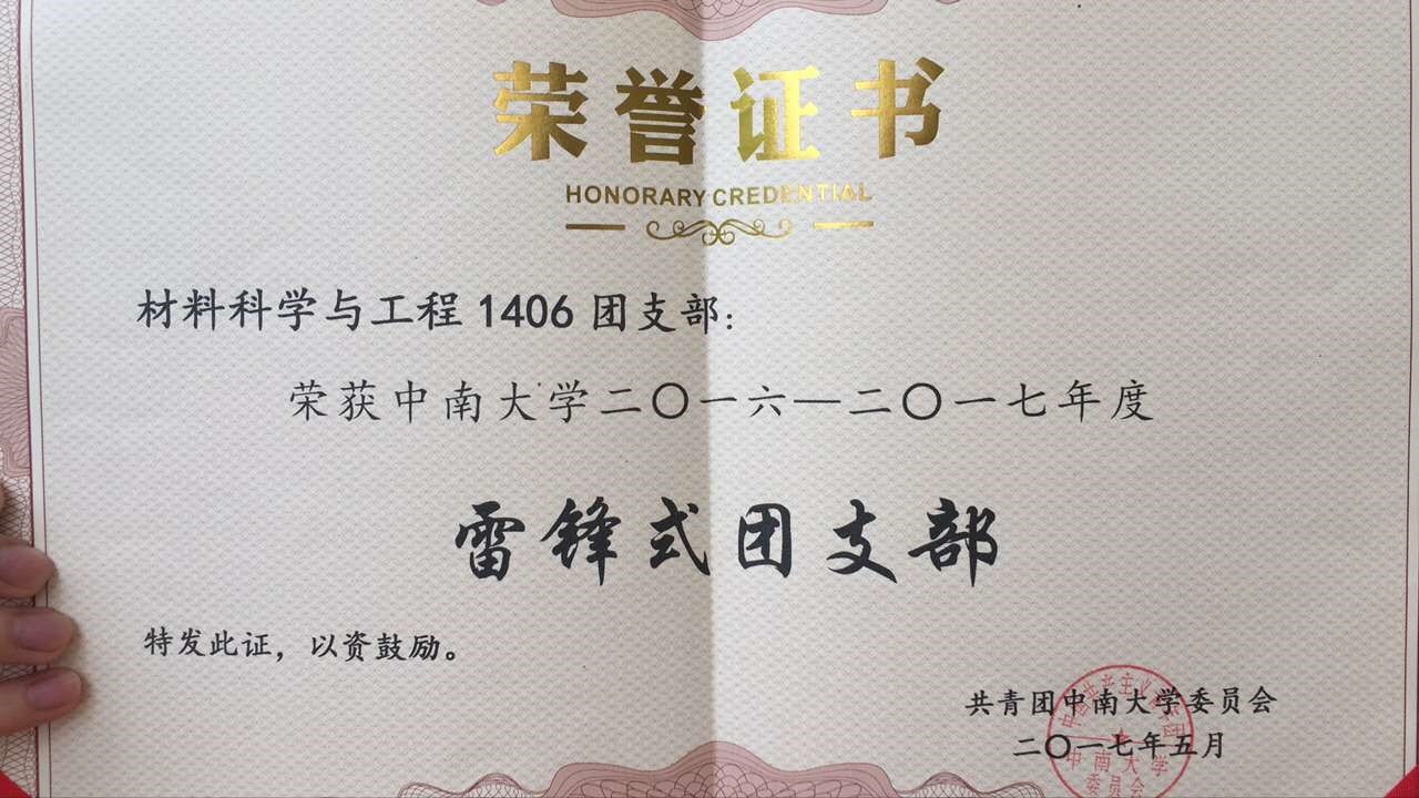 在2017年五四青年节之时,材料1406团支部荣获“伟德bv1946官网首页2016-2017年度雷锋式团支部”荣誉称号。此外,该团支部李伟泽、文璟、齐瑞三位同学荣获 “优秀团干”称号,陈鑫、廖磊获得“优秀团员”称号。