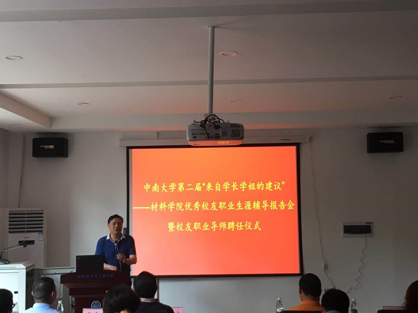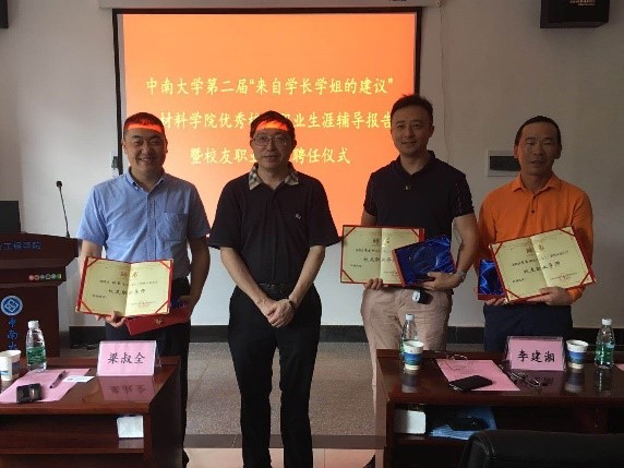 5月16日下午,伟德bv1946官网首页第二届“来自学长学姐的建议”之第二届材料院学长座谈会暨校友职业导师聘任仪式在伟德bv1946官网首页特冶楼206隆重举行。广东和胜工业铝材股份有限公司董事长李建湘、江苏豪然喷射成形合金有限公司董事长张豪、问库集团和格兰博科技股份有限公司董事崔龙竹三位优秀校友回到学院为同学们作职业生涯辅导,材料院党委书记王德志、院长梁叔全、党委副书记胡小清出席报告会,会议由胡小清副书记主持。会上,梁叔全院长为李建湘、张豪、崔龙竹3位优秀校友颁发了职业导师聘书。
