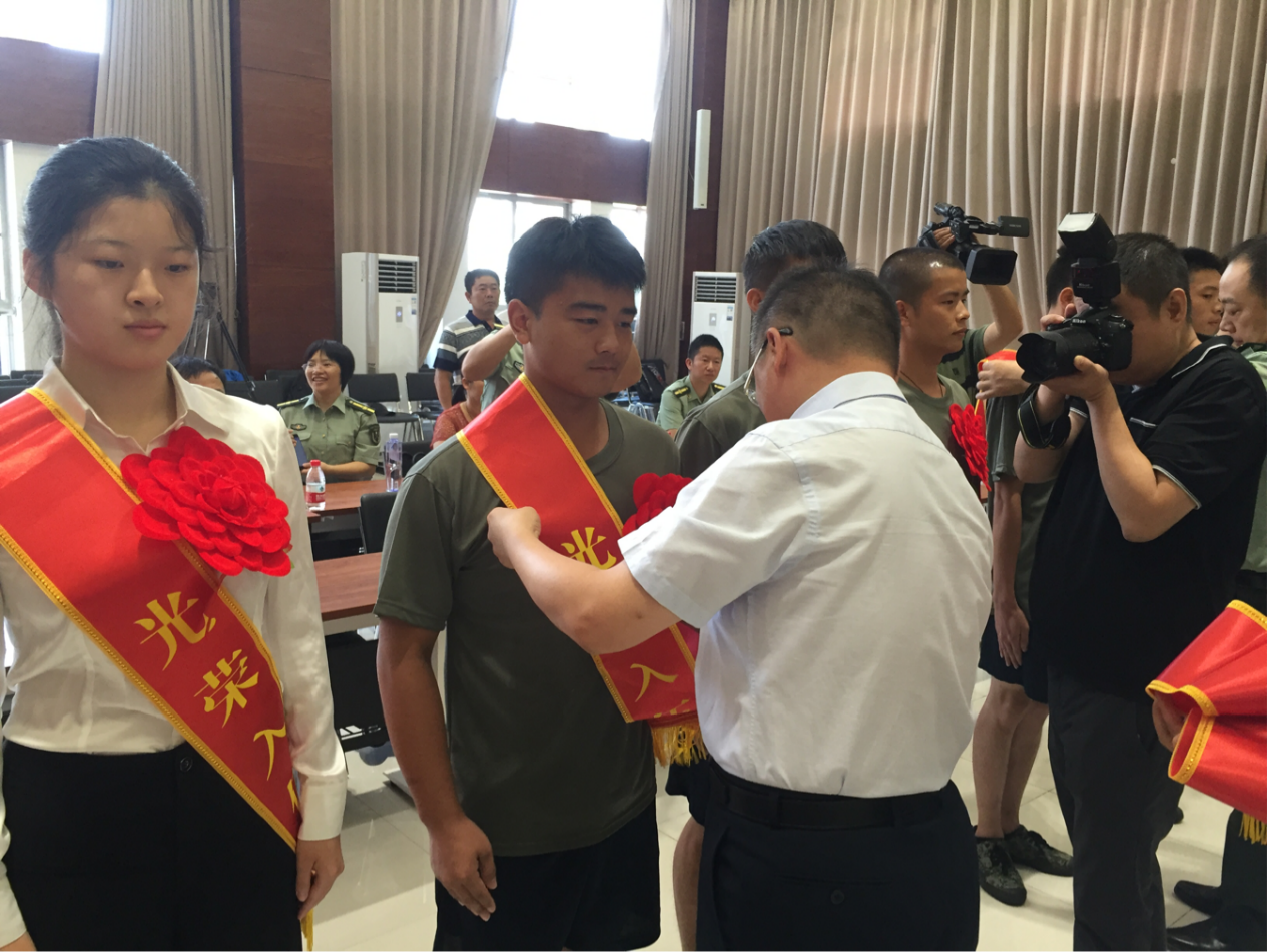 仪式首先由退役大学生士兵为即将入伍的大学生佩戴大红花并与他们进行经验交流。新入伍的大学生们身戴红花,人人脸上踌躇满志,对未来的军营生活充满期待。而退役的大学生则将所有对军营的不舍和对国防事业的担当寄予红花,交付到新一代入伍学生手中。