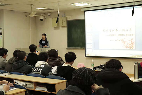 会议伊始,蔡圳阳老师讲解了大学生朋辈心理互助工作。蔡老师介绍了心理委员设立初衷、工作内容并提出了工作要求。