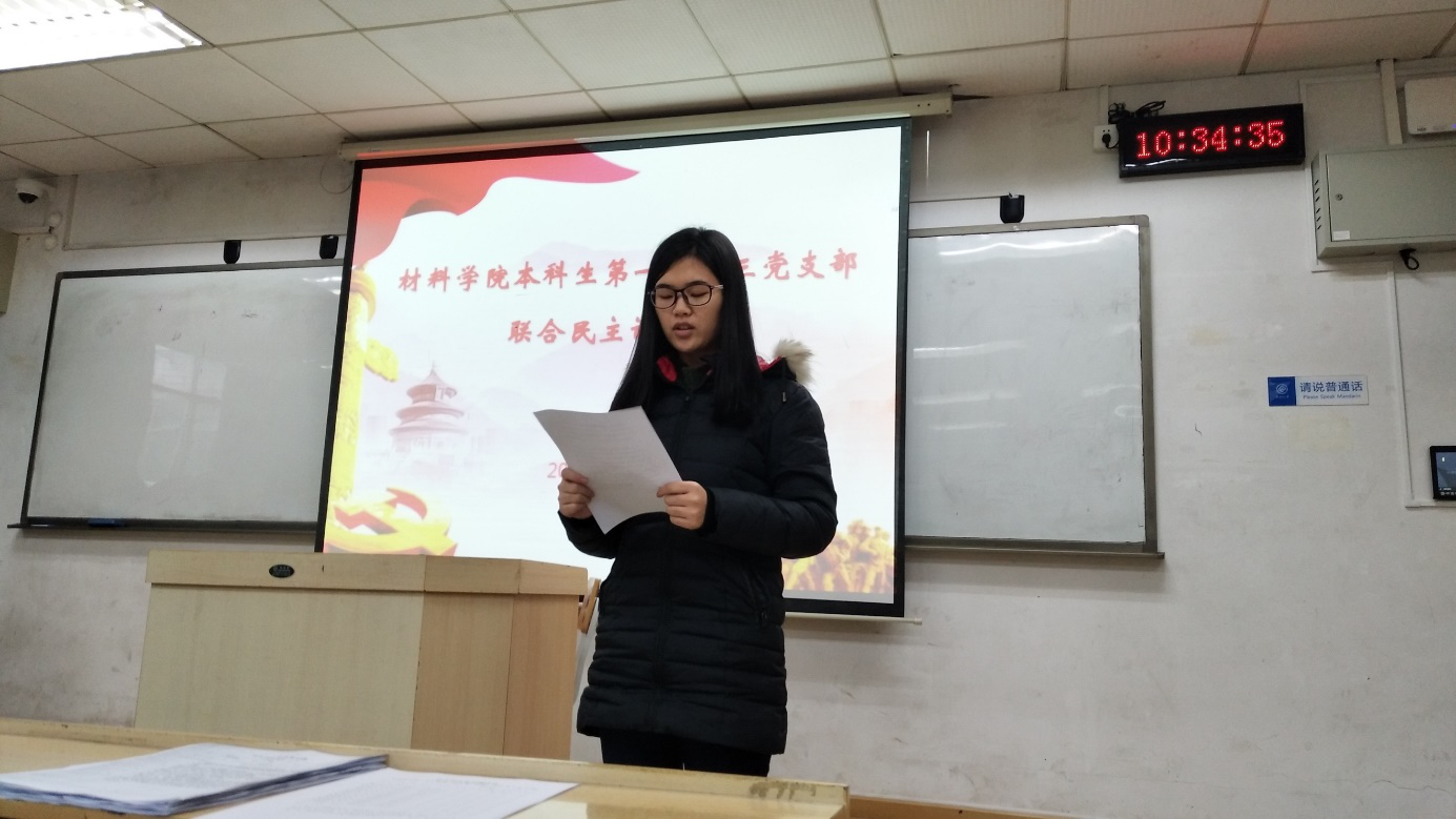 大会第二项是专题组织生活会,由第一、第三党支部党员进行发言。他们纷纷对自己的2018年一年的生活、学习、思想等各方面做了充分的总结,并且提出了未来的规划与期盼。第一党支部的组织委员邢振月表示,在学习上,因自身认真严谨的态度,取得了不错的成绩,并且达到了保研的要求;在生活上严于律己、宽以待人、与人为善;工作中,勤勤恳恳,完成了创新生活会案例申报、举办党支部大会等多项活动,团队协作能力大有提升;对于自身的不足,如做事拖沓,也下定决心要改善。每一位同志在进行深刻的自我剖析与发言后,都获得了阵阵掌声。
