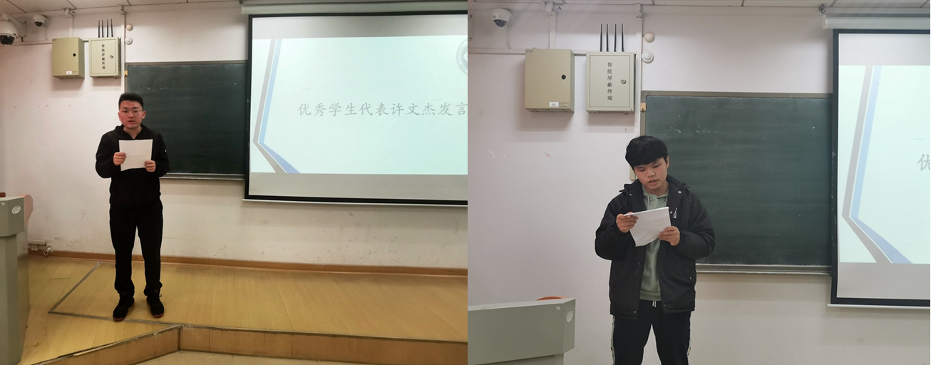 学生代表许文杰,周坤上台发言,两位分享了自己上一年在创新培养实验室的收获,并且就实验中合理分工、实验研究态度等方面向学弟学妹们提出了良好的建议,期待他们在新的一年中得到良好的锻炼。