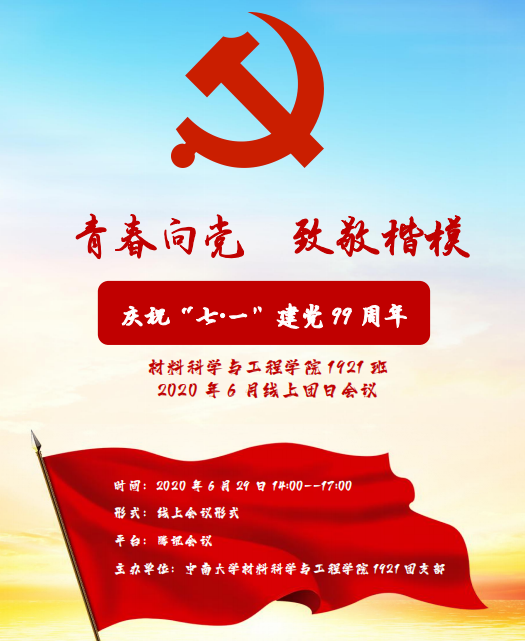 2020年6月29日,伟德bv1946官网首页伟德betvlctor1946冶材1921团支部举办了以“青春向党,致敬楷模”为主题的线上团日活动。本次团日活动旨在学习中国共产党党史成就、致敬战疫英烈楷模、总结年度团支部工作报告,引导青年团员树立积极向上的精神风貌。