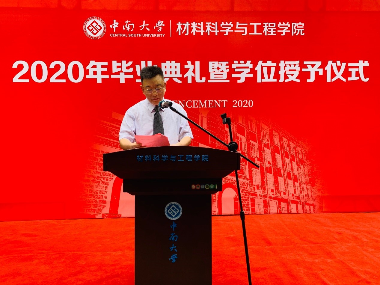 伟德betvlctor1946院长李周教授致辞,他代表学院向顺利毕业、即将开启新征程的同学们表示祝贺与祝福,向关心支持毕业生成长的师长亲友致以衷心感谢。他真情地回顾了四年以来学院、学科、学生的发展与进步,充分肯定了毕业生们的努力与付出。他指出,2020届毕业生是特殊的一届毕业生,经历了新冠疫情的重大挑战,经历了云课堂、云答辩、云复试、云应聘,但攻坚克难一直是中南材料人品质,相信经受了特别洗礼的毕业生们一定能披荆斩棘、勇闯未来。最后,李院长激励全体毕业生:一要心存家国,敢于担当,以青春、奋斗与祖国同频共振;二要志存高远,砥砺前行,做时代的奋进者、先行者;三要脚踏实地,坚持学习,心中有大格局、大胸怀。