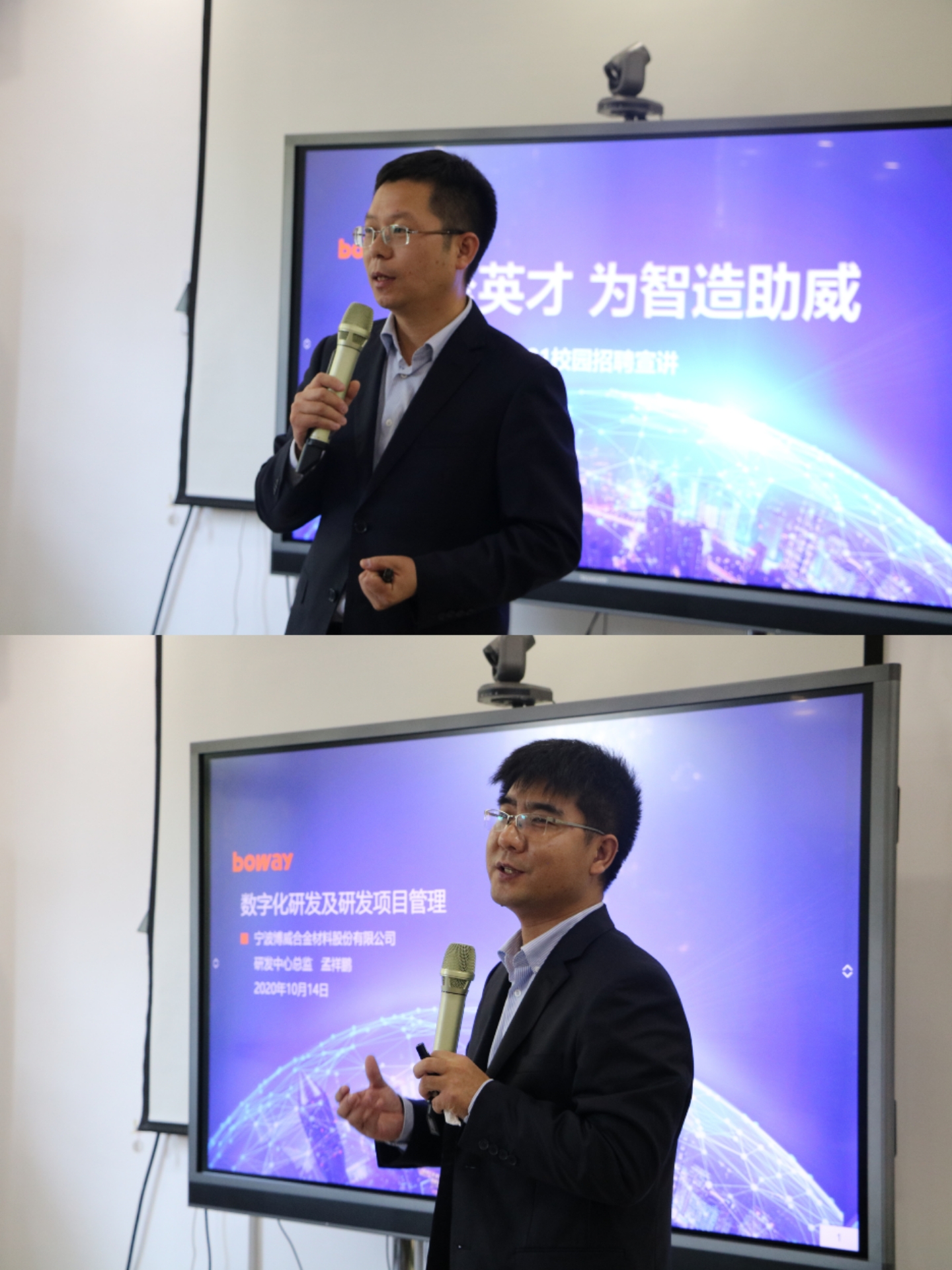 博威合金人力中心张宪军总监进行了职业发展规划及招聘宣讲。张宪军总监表示博威公司十分注重研发,追求研发和创新,满足科学进步需求,公司并不是为了发表论文或者为了某个专利,而是为了满足市场的需求。张宪军总监鼓励同学们来到博威公司进行实习,并希望更多的同学能够进入博威公司,成为博威团队的一员。