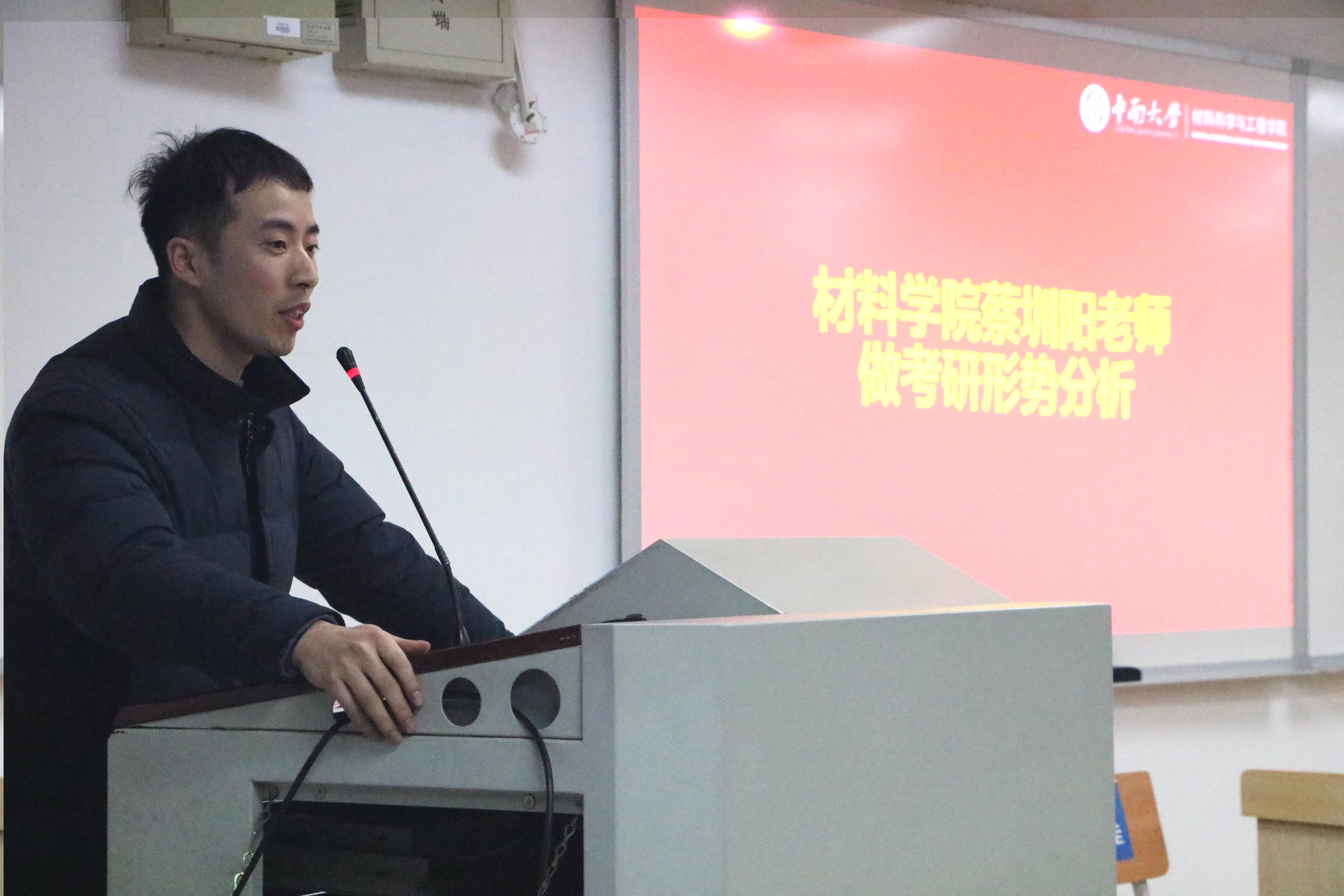 学工办主任蔡圳阳对考研形势进行了分析,对考研结果情况不同的同学分别提出了建议,并且指出了其对考研调剂的独到见解。他指出,应该根据个人现状以及个人能力做出选择,在接下来的时间里,做好准备,将眼光放长远。