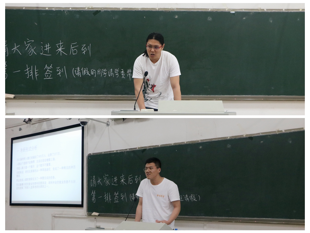 随后,考研406分的李坤同学和目前工作于明基电通科技有限公司的张寅翾同学均以时间轴的形式向同学们讲述了大四学年考研与求职就业的相关事宜。并用亲身经历告诉学弟学妹们自己在求职道路上遇到的困难与成功的技巧。“要了解自身能力,不要认定考研是唯一出路”,“保持良好的第一印象是招聘的第一步;其次,要学会灵活变通并保持谦虚踏实的态度,这样在找工作时才会被面试官青睐。”