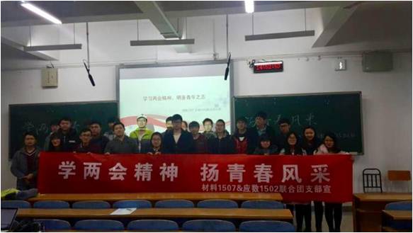 3月19日,材料1507班与应数1502班在新校区B座110联合举办“学两会精神,杨青春风采”主题团日活动。本次活动旨在响应校团委号召,宣传两会知识,了解当今国策。活动由材料1507团支书叶铭主持。