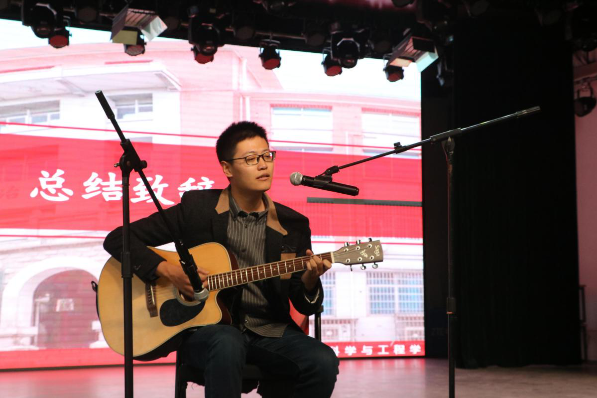 大会的最后一项是张彦隆老师进行总结致辞。他对团学会全体成员提出了表扬,对本学期以来的工作进行了总结,并对本届团学会提出了更高的要求。最后,深受现场同学们感染的张老师也拿起了吉他和麦克风,为团学会全体成员献唱歌曲。同学们纷纷拿出手机拍照摄像,记录下这师生共渡的美好的瞬间。