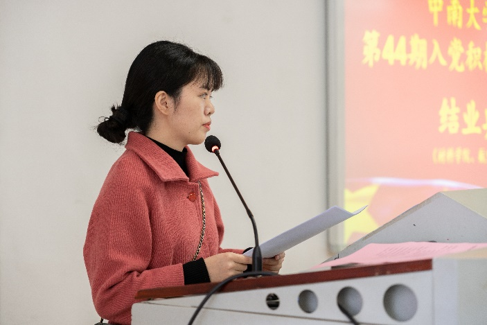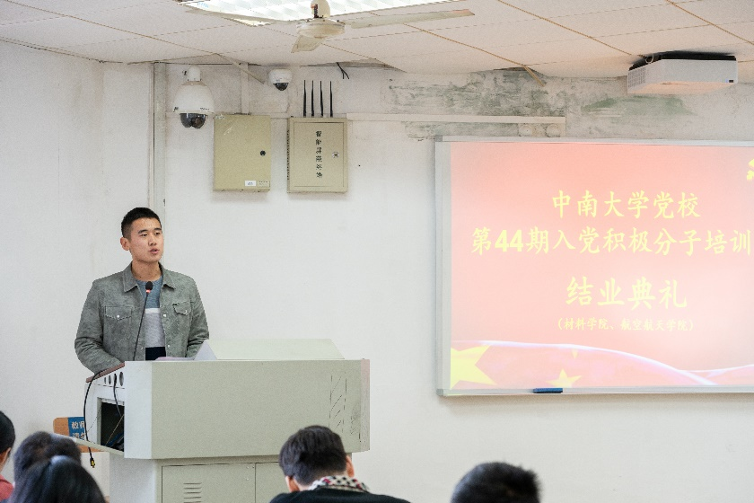 随后,优秀学员代表材料国际1901班李卓锐同学发言。李卓锐同学在部队期间写下了入党申请书,在培训学习期间提高了自己的理论知识水平,对党有了更加清晰深刻的认识。同时,李卓锐也下定决心将身边优秀的共产党人作为榜样,不断塑造自己、提升自己,以求早日达到一名合格共产党员的标准。