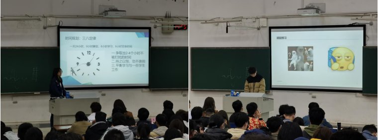 接下来大一年级朱萧晓同学和张涵宇同学在学习方面为同学们提供了诸多经验与心得。首先是时间规划方面,他们提出要合理利用平时的碎片时间,并做到持之以恒,功不唐捐;其次是学习环境方面,他们建议同学们学习时关闭手机,并及时清理桌面,为自己营造良好的学习氛围;最后是学习心态方面,他们鼓励大家专注学习的同时也要适当放松,及时调整心态。
