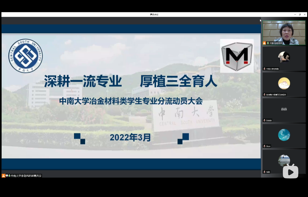 2021级冶金材料类学生专业分流动员大会于2022年3月26日成功召开,为响应防疫要求,会议以腾讯会议在线直播的形式线上进行。伟德betvlctor1946、粉末冶金研究院、冶金与环境学院、资源加工与生物工程学院各院领导、教务员、辅导员、班导师、学生及部分家长参会,伟德betvlctor1946辅导员张彦隆老师主持会议。