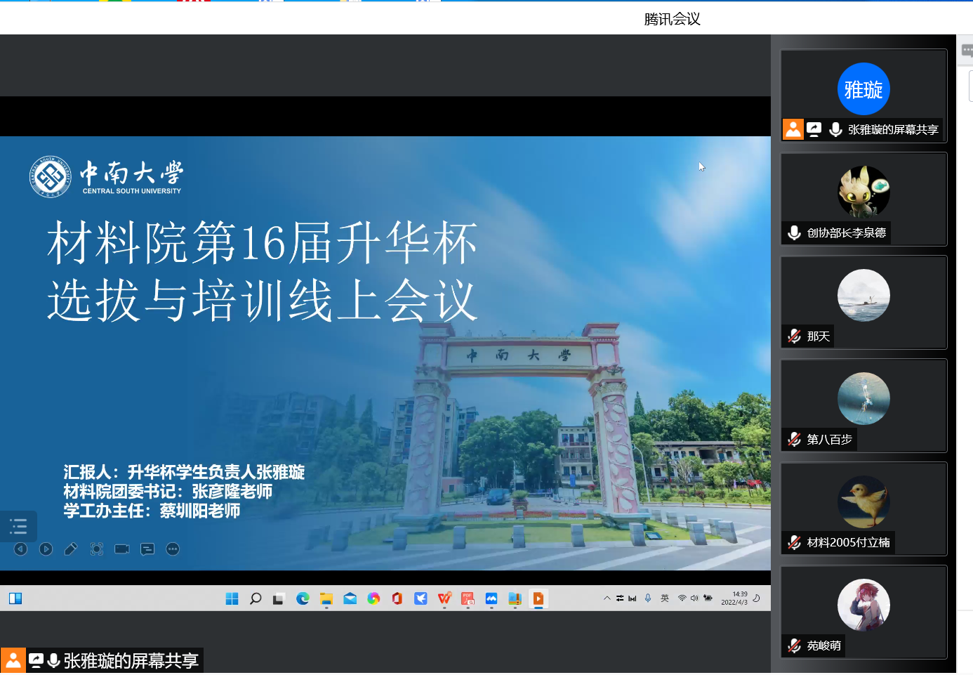 伟德bv1946官网首页第十六届“升华杯”的申报工作正在如火如荼的进行,为了提高参赛作品的质量与水平,展现材料学子在该项赛事中“知行合一,经世致用”的风采;学院组织老师于4月3日下午14:30对各个项目立项的基础、创新性、必要性和可行性进行充分论证,并对目前已有的申报项目进行选拔与培训。本次选拔与培训会邀请了伟德betvlctor1946负责“升华杯”组织指导工作的专职教师蔡圳阳老师、张彦隆老师,材料院升华杯负责人张雅璇同学,材料院创新创业协会部长李泉德同学,以及所有项目负责人参会。