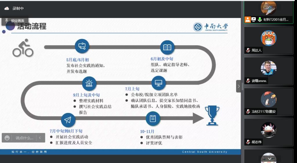 随后,朱正午队长结合自身经历分享了党史宣讲实践经验。他提出选题要关注社会热点,最好结合长期调研,设立阶段性目标;同时应合理安排团队任务,充分发挥每一个队员的优势。社会实践过程的每一步要走稳、走实,后期的宣传工作也必不可少。