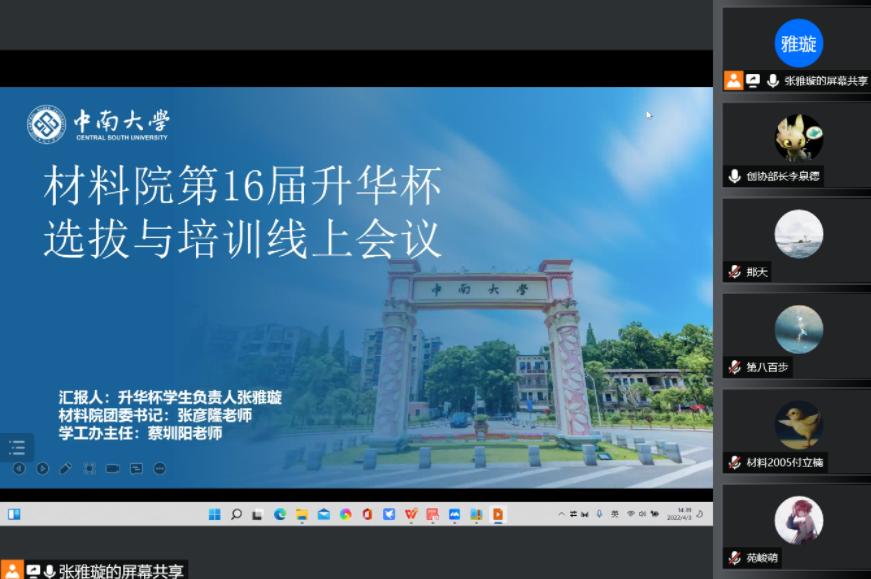 图为材料院第十六届升华杯选拔与培训线上会议