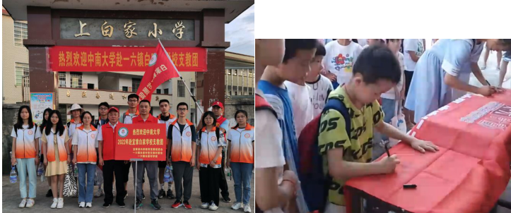 第一天,实践队成员到达上白家小学,举办“开营仪式”。队员为孩子们介绍本次志愿活动的有关内容,成员以及注意事项,组织孩子们进行“签名”仪式,开展“破冰游戏”,并鼓励孩子们进行自我介绍。孩子们主动性强,踊跃参与各项活动。