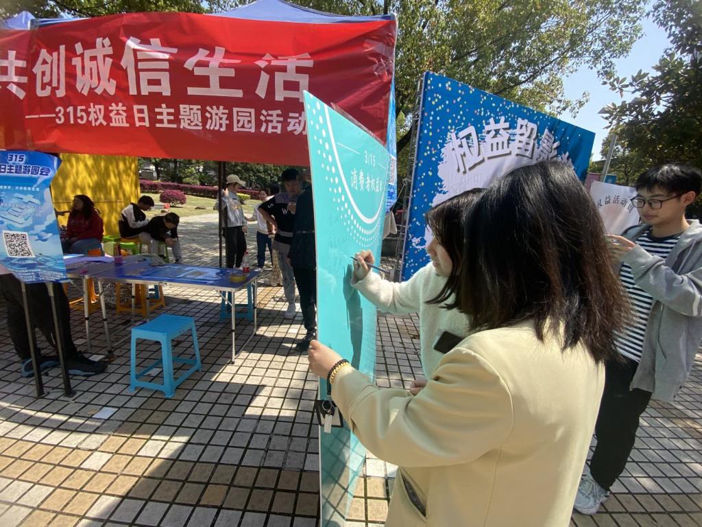在游园会摊位前的易拉宝上,同学们畅所欲言,写下自己在校园消费生活中希望解决的权益问题。同时,通过填写问卷,同学们了解到与日常生活息息相关的消费权益知识,随后拿到了“3”号通关卡片。