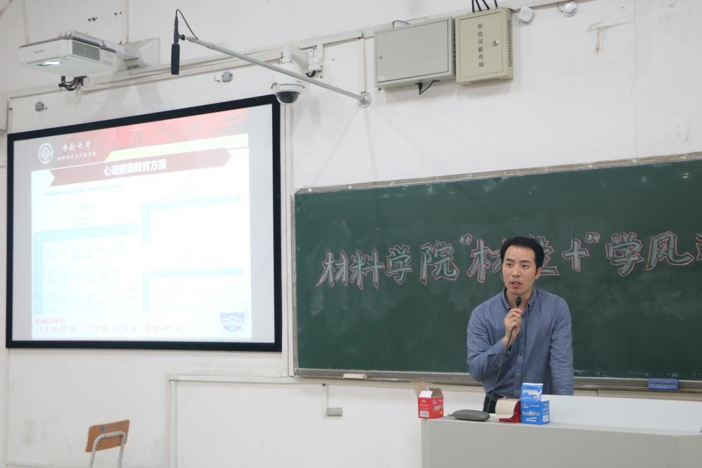 会议第二项,蔡圳阳老师重点阐述学生日常工作管理与大学生涯规划两方面。蔡老师首先着重讲到日常工作管理中的安全工作,包括交通安全、财产安全、实验室安全等,提高了同学们的安全意识。其次,从成绩规划、学生工作、志愿实践、竞赛科研、出国留学等方面为同学们进行详细讲解,为材料院的学子们指明了方向。