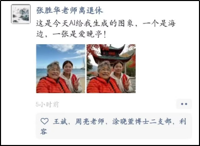 活动虽已落幕,但温暖仍在延续。当晚,辅导员陈少华老师在朋友圈刷到了离退休处张胜华老师的分享。屏幕上展示着两张由AI生成的精美图片——一幅是碧海蓝天的壮阔景象,另一幅则是秋意盎然的爱晚亭。张老师配文道:“这是今天AI给我生成的图像!”这寥寥数语,朴实无华,却胜过千言万语,是对那位帮助他解锁新技能的志愿者同学最直接的感谢,更是对所有为本次活动倾情付出的老师和同学们最温暖、最有力的认可与褒奖。学生们的劳动付出,收获了真实而温暖的社会回响。